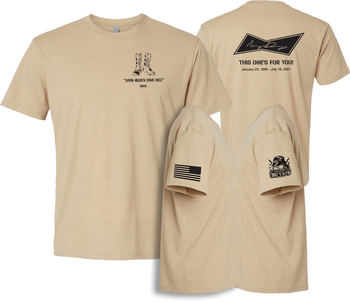 - “Given Heaven Some Hell Boots” Logo on front, “This Ones For You” on back, American Flag on Right Sleeve, MoVets Outdoors Fishing graphic on left sleeve